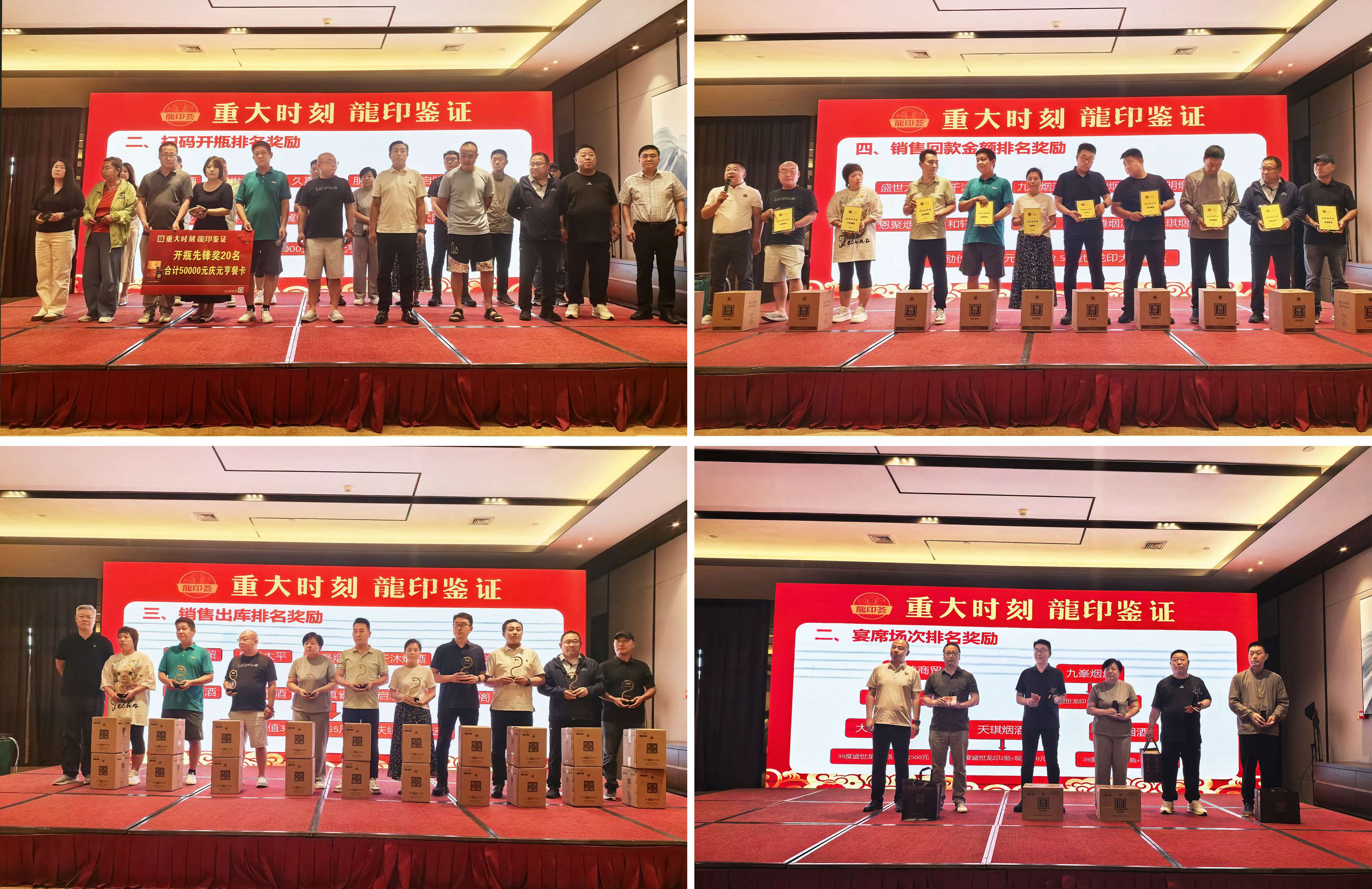 為感謝經(jīng)銷商伙伴長久以來的支持和貢獻,活動現(xiàn)場還設置了頒發(fā)環(huán)節(jié),石家莊戰(zhàn)區(qū)龍印部銷售總監(jiān)孫坤申、恒潤德酒類品牌管理有限公司董事長潘雁群、石家莊戰(zhàn)區(qū)龍印部區(qū)域經(jīng)理徐立國、恒潤德酒類品牌管理有限公司龍印事業(yè)部經(jīng)理張原分別為開瓶率、履約、回款、宴席做出突出貢獻的終端客戶進行頒獎。